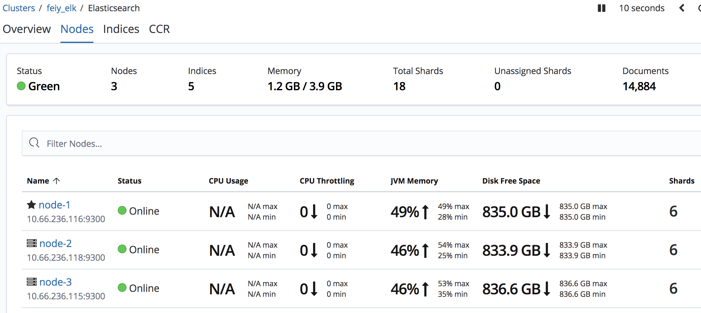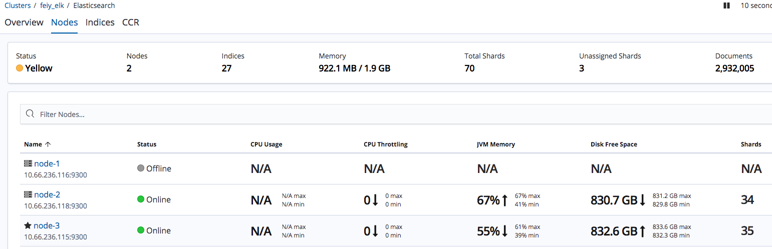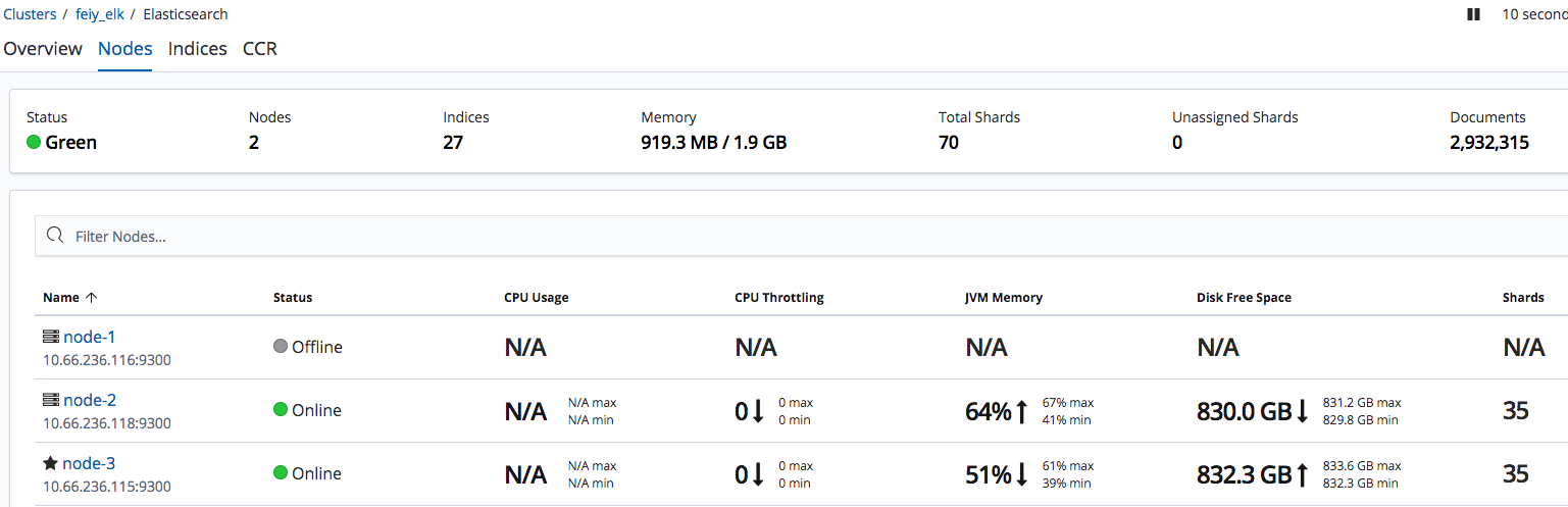 1 2 3 4 5 6 7 8 9 10 11 12 13 14 15 16 17 18 # curl http://wan_ip:9200/_cluster/health?pretty { "cluster_name" : "feiy_elk", "status" : "green", "timed_out" : false, "number_of_nodes" : 3, "number_of_data_nodes" : 3, "active_primary_shards" : 9, "active_shards" : 18, "relocating_shards" : 0, "initializing_shards" : 0, "unassigned_shards" : 0, "delayed_unassigned_shards" : 0, "number_of_pending_tasks" : 0, "number_of_in_flight_fetch" : 0, "task_max_waiting_in_queue_millis" : 0, "active_shards_percent_as_number" : 100.0 }