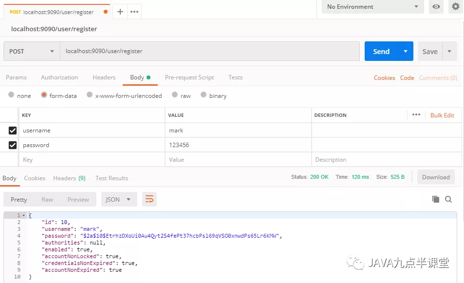 | @RestController @RequestMapping("/user") public class UserController { @Autowired UserServiceDetail userServiceDetail; @PostMapping("/register") public User postUser(@RequestParam("username") String username , @RequestParam("password") String password){ return userServiceDetail.insertUser(username,password); } }