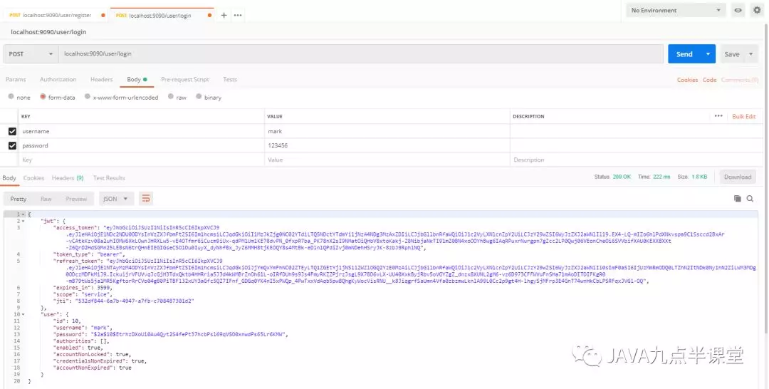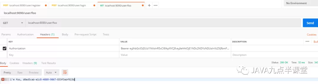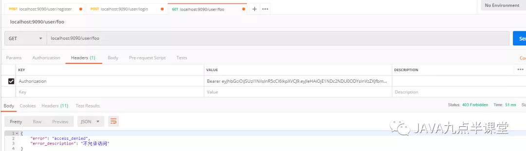 因为没有权限,访问被拒绝,我们手动在数据库添加”ROLE_ADMIN”权限,并与该用户关联。重新登录并获取Token,重新请求“/user/foo”接口