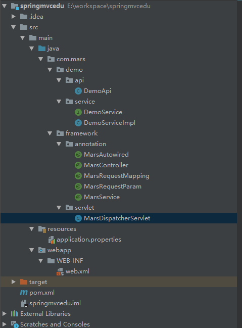 com.mars.demo 和 com.mars.framework,以便随后只扫描业务代码。 - 这里是自己手写Spring框架,所以不会引入任何Spring项目相关的包。