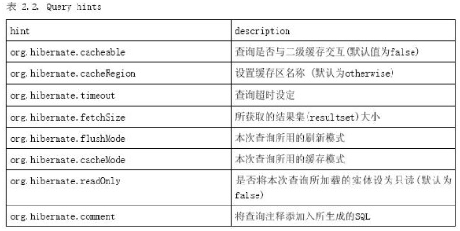 可以通过定义 QueryHint 数组的 hints 属性为查询提供一些 hint 信息。下图是一些 Hibernate hints: