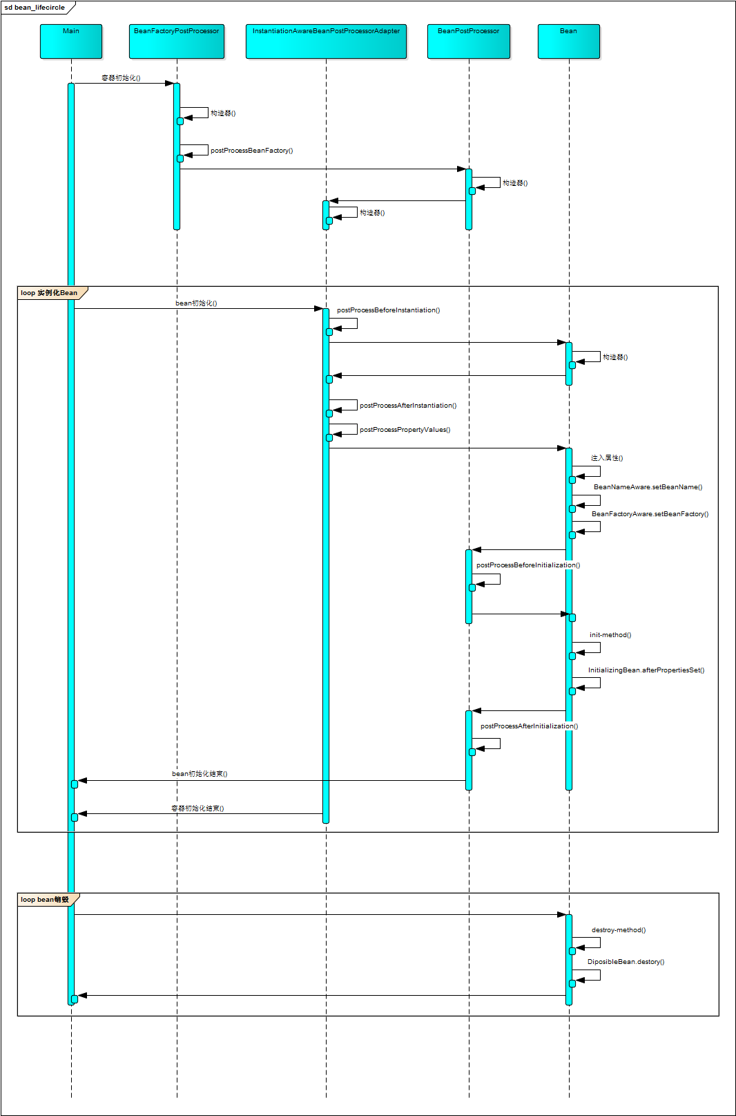 | 现在开始初始化容器 2014-5-18 15:46:20 org.springframework.context.support.AbstractApplicationContext prepareRefresh 信息: Refreshing org.springframework.context.support.ClassPathXmlApplicationContext@19a0c7c: startup date [Sun May 18 15:46:20 CST 2014]; root of context hierarchy 2014-5-18 15:46:20 org.springframework.beans.factory.xml.XmlBeanDefinitionReader loadBeanDefinitions 信息: Loading XML bean definitions from class path resource [springBeanTest/beans.xml] 这是BeanFactoryPostProcessor实现类构造器!! BeanFactoryPostProcessor调用postProcessBeanFactory方法 这是BeanPostProcessor实现类构造器!! 这是InstantiationAwareBeanPostProcessorAdapter实现类构造器!! 2014-5-18 15:46:20 org.springframework.beans.factory.support.DefaultListableBeanFactory preInstantiateSingletons 信息: Pre-instantiating singletons in org.springframework.beans.factory.support.DefaultListableBeanFactory@9934d4: defining beans [beanPostProcessor,instantiationAwareBeanPostProcessor,beanFactoryPostProcessor,person]; root of factory hierarchy InstantiationAwareBeanPostProcessor调用postProcessBeforeInstantiation方法 【构造器】调用Person的构造器实例化 InstantiationAwareBeanPostProcessor调用postProcessPropertyValues方法 【注入属性】注入属性address 【注入属性】注入属性name 【注入属性】注入属性phone 【BeanNameAware接口】调用BeanNameAware.setBeanName() 【BeanFactoryAware接口】调用BeanFactoryAware.setBeanFactory() BeanPostProcessor接口方法postProcessBeforeInitialization对属性进行更改! 【InitializingBean接口】调用InitializingBean.afterPropertiesSet() 【init-method】调用<bean>的init-method属性指定的初始化方法 BeanPostProcessor接口方法postProcessAfterInitialization对属性进行更改! InstantiationAwareBeanPostProcessor调用postProcessAfterInitialization方法 容器初始化成功 Person [address=广州, name=张三, phone=110] 现在开始关闭容器! 【DiposibleBean接口】调用DiposibleBean.destory() 【destroy-method】调用<bean>的destroy-method属性指定的初始化方法