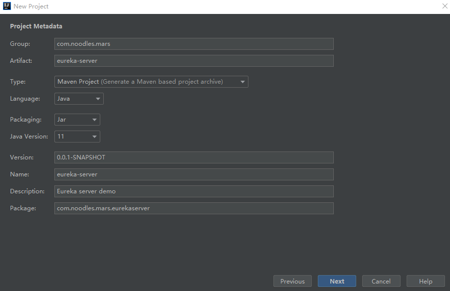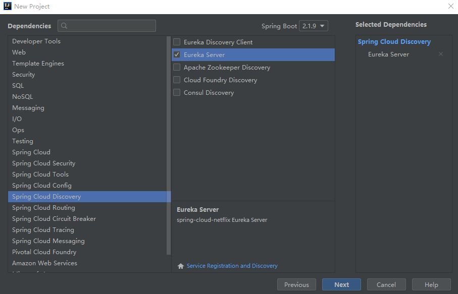 点击next->选择Spring Cloud Discovery->右侧选择Eureka Server, 然后点击下一步知道项目创建成功: