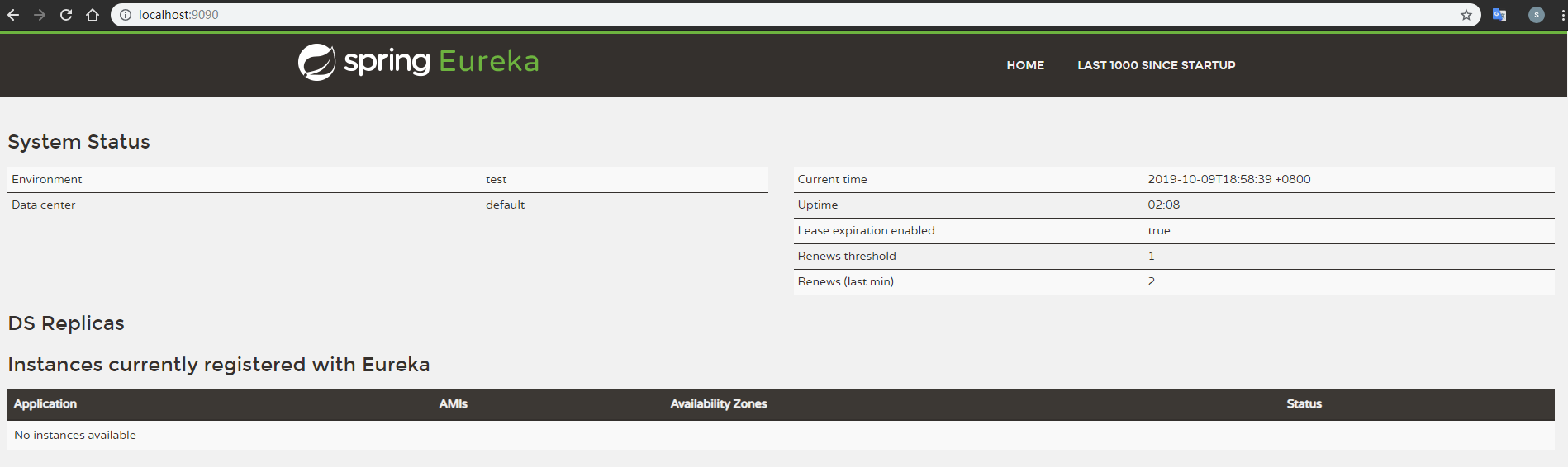 启动项目,打开浏览器输入http://localhost:9090 , 打开注册中心的网址: