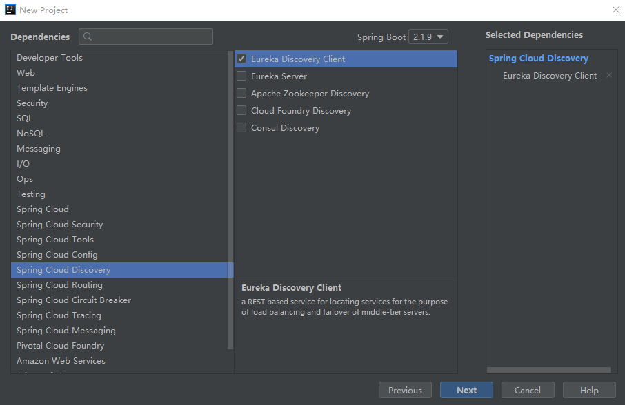 新建一个服务提供者 项目创建步骤和创建注册中心一样,只是在选择Spring Cloud Discovery时选择Eureka Discovery Client: